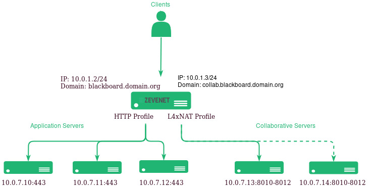 In our example, the Blackboard application service is being published on the IP 10.0.1.2 which resolves for the domain blackboard.domain.org in the DNS and using the TCP ports 443 and 80 (redirecting to the port 443).