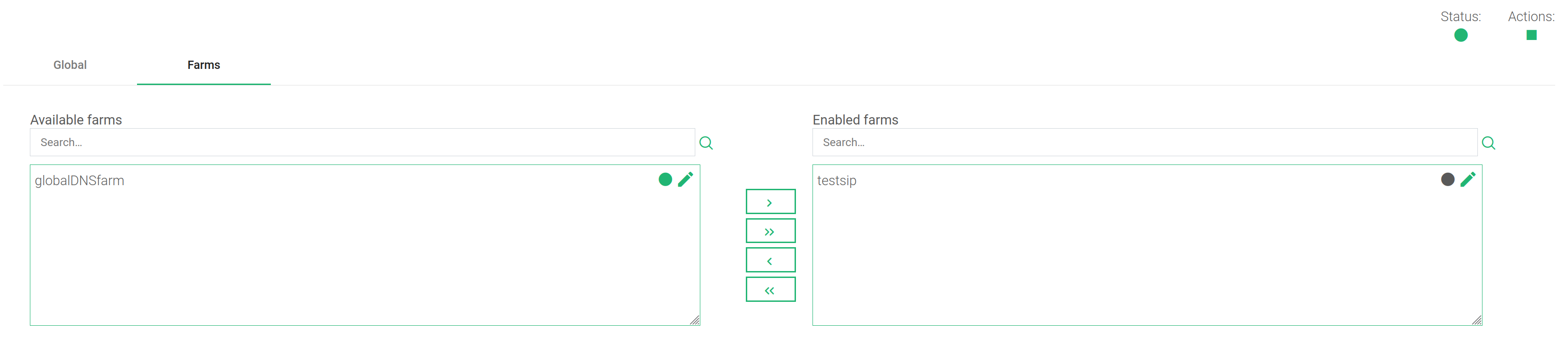 This section allows assigning the DoS rule to one or more farms to assign or remove the rule on all farms using the right or left double arrow buttons. Select one or more farms (with the shift key pressed) and assign, or remove the DoS rule then, click on the right or left single arrow button.