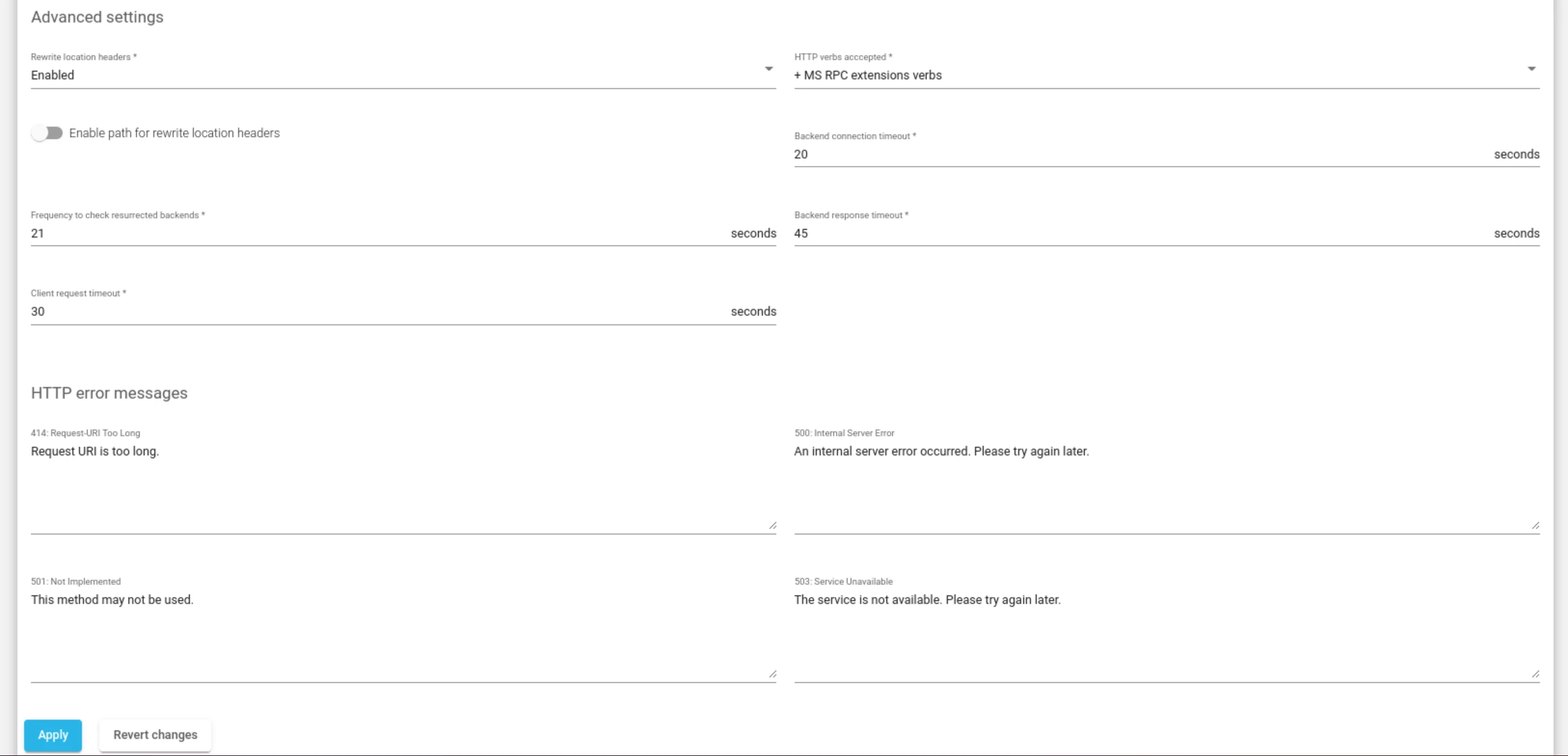 Rewrite Location headers. If enabled, the service is forced to modify the Location and Content-location headers in response to the clients. If they have the value of the backend itself or the VIP (but with a different protocol) the response will be modified to show the virtual host in the request. If the toggle button enabled and compare backends is enabled, then only the backend IP address is compared. This is essential when redirecting requests to an HTTPS listener on the same server as the HTTP listener. When enable and compare backends is selected, a flag called Enable path for Rewrite location Headers will be available. Enable this flag if you are working with Rewrite URLs. This value will force you to check the URL responses and will change the response to the original if a rule is configured in Rewrite URLs. If this field is enabled, it will override the same directive in the global section.